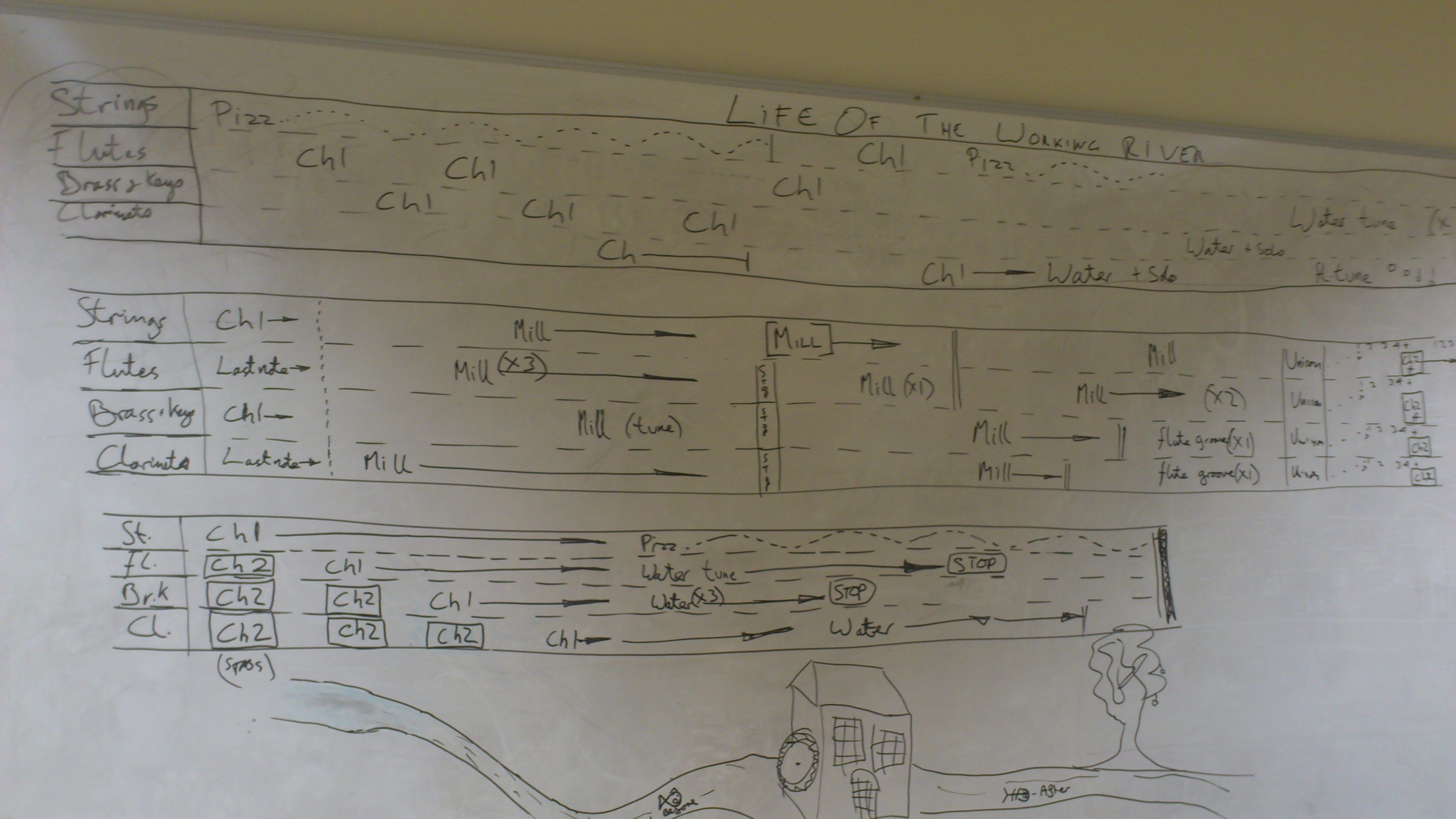 I was helping with the compositional workshops with music students from Belper and Murray Park secondary schools. It was really good to be involved and to learn from other workshop leaders, such as Jack Ross from Sinfonia ViVA and Elly Lucas from the Mills & Chimneys ensemble. It’s always good to pick up new warm-up exercises, ways of encouraging students to compose, and also to hear compositions from other musicians. Both secondary school compositions were brilliant and I was so proud to see them perform. Murray Park’s dealt with the story of Repression-Rebellion-Freedom and Belper school wrote an instrumental piece about the story of the mill, “Life of the Working River”. The photo shows the musical chart for Belper school’s music, complete with a picture of the mill – clearly very important in the creative process!